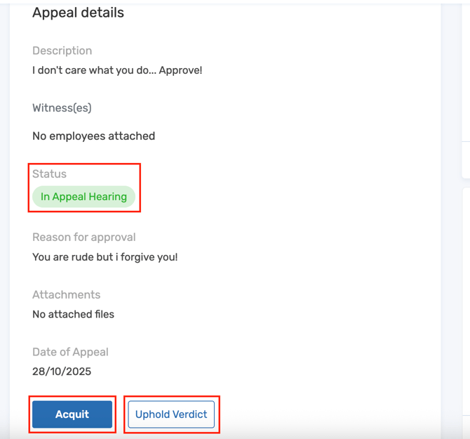 Meeting card details now remain visible on the appeal page even after an employee has been acquitted. Previously, once acquittal was recorded, the meeting information would disappear from view.